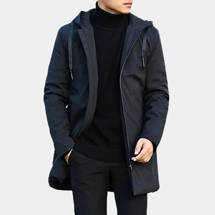 This men’s jacket features a clean, modern design with a long, straight silhouette and a lightly quilted inner lining for added warmth. The jacket is finished with a fixed hood and a full-length zipper closure, creating a practical and refined look suitable for cooler days. The minimalist exterior and streamlined shape make it ideal for everyday wear during autumn and winter.
