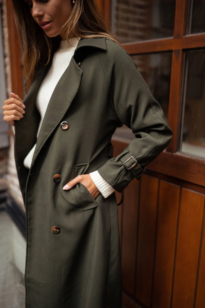 This women’s trench coat offers a refined balance between timeless design and everyday practicality. Crafted with a smooth, structured fabric, the coat features a classic double-breasted front and a waist belt that creates a flattering, feminine silhouette. The mid-length cut provides elegant coverage, while the adjustable belt and cuff details add a tailored finish. Designed for transitional seasons, this trench coat layers effortlessly over knitwear or lightweight tops, making it suitable for both casual city wear and more polished occasions.