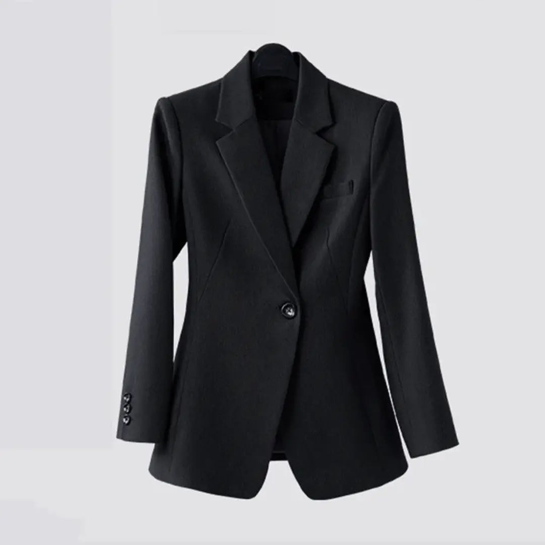 Top: Single button blazer with classic lapels and clean lines